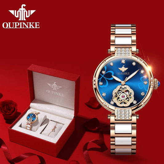 Swiss OUPINKE beautiful / elegant Watch for Women Fashion Ceramic Strap Sapphire mirror Wrist Watch